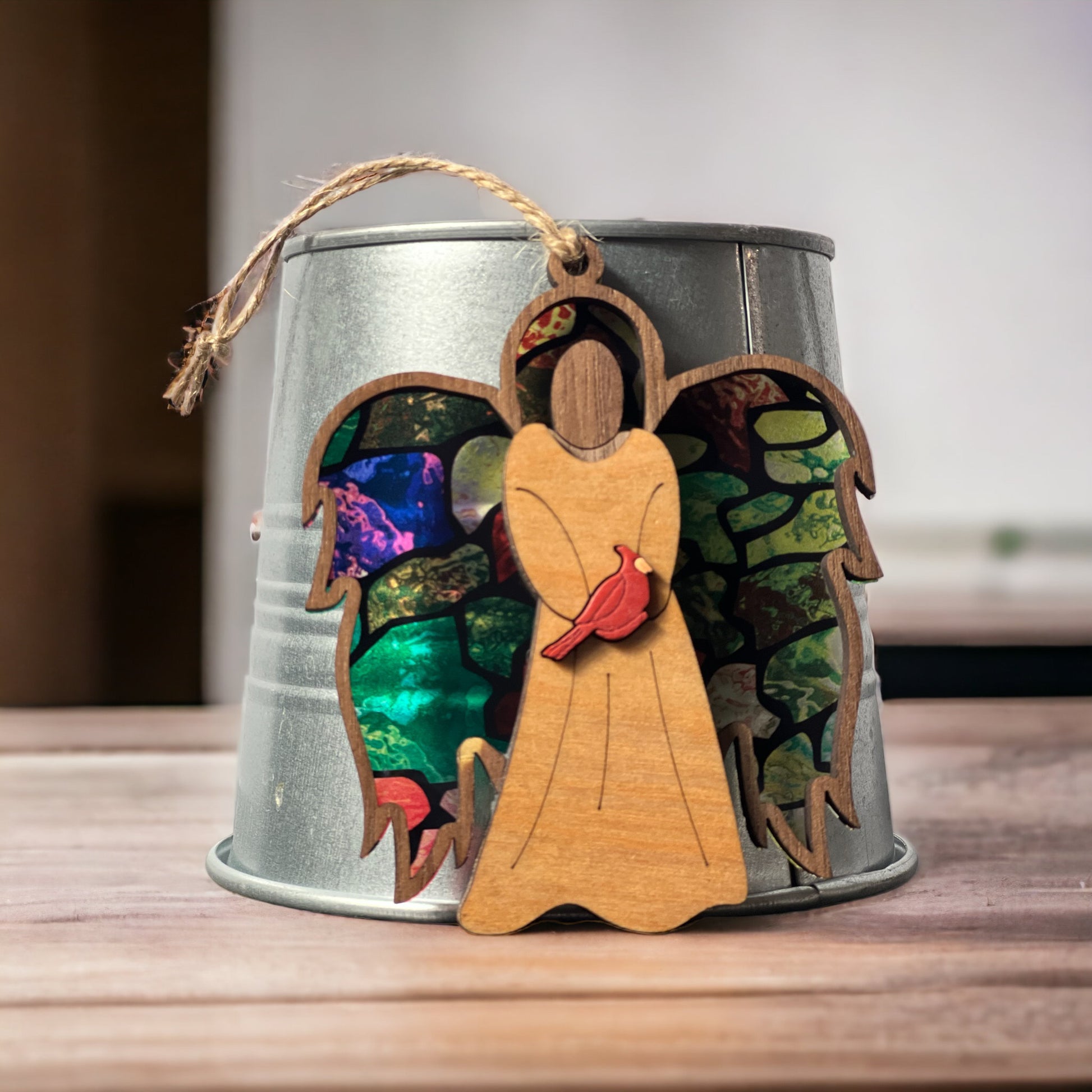 Enhance your home decor with our elegant wooden angel ornament, gently holding a cardinal in her hands. This meticulously crafted piece radiates warmth and serenity, serving as an ideal addition to your living space or a meaningful gift for someone dear.