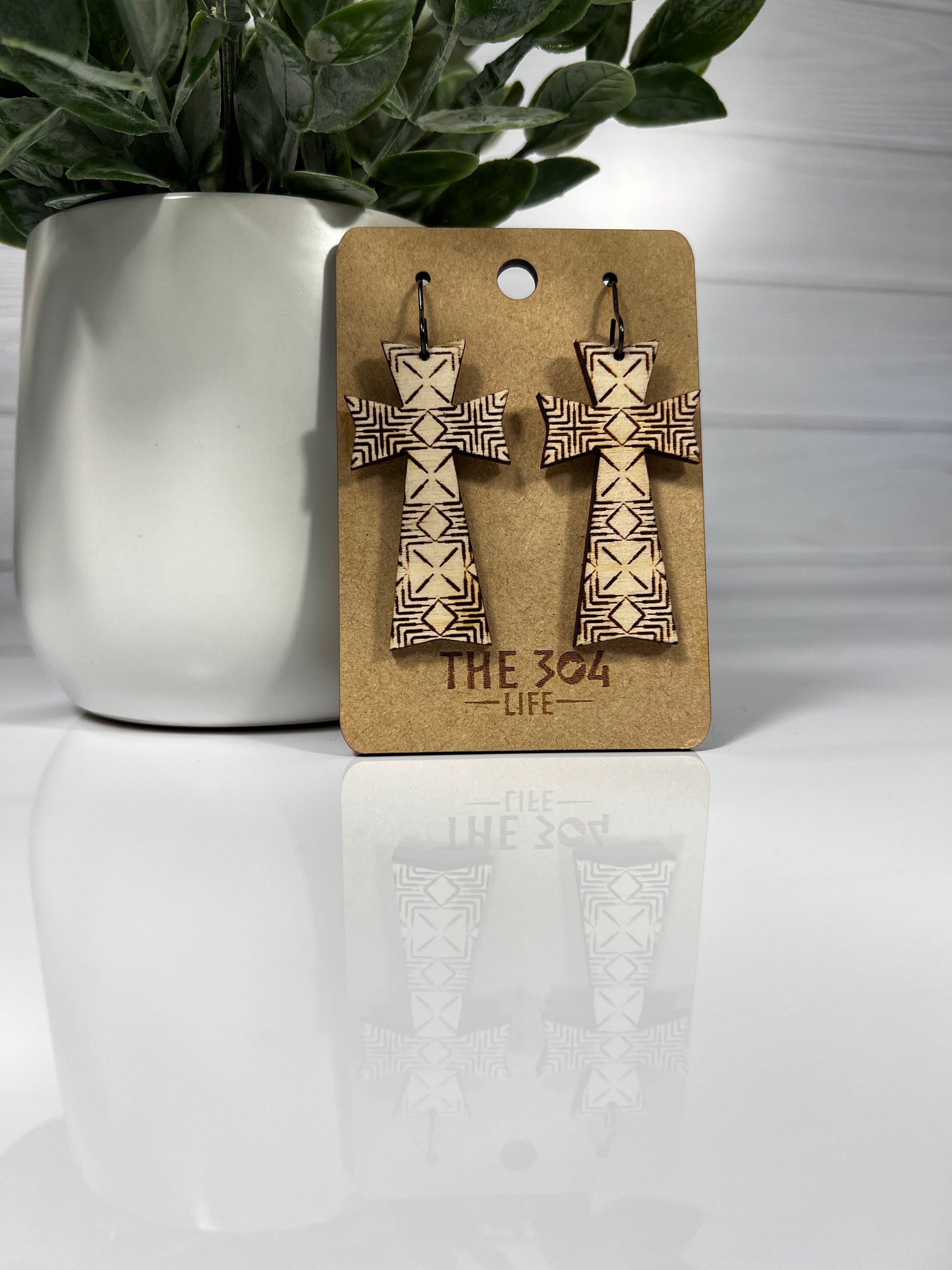 Boho Inspired Wood Cross Earrings with Intricate Laser Engraved Square X Design