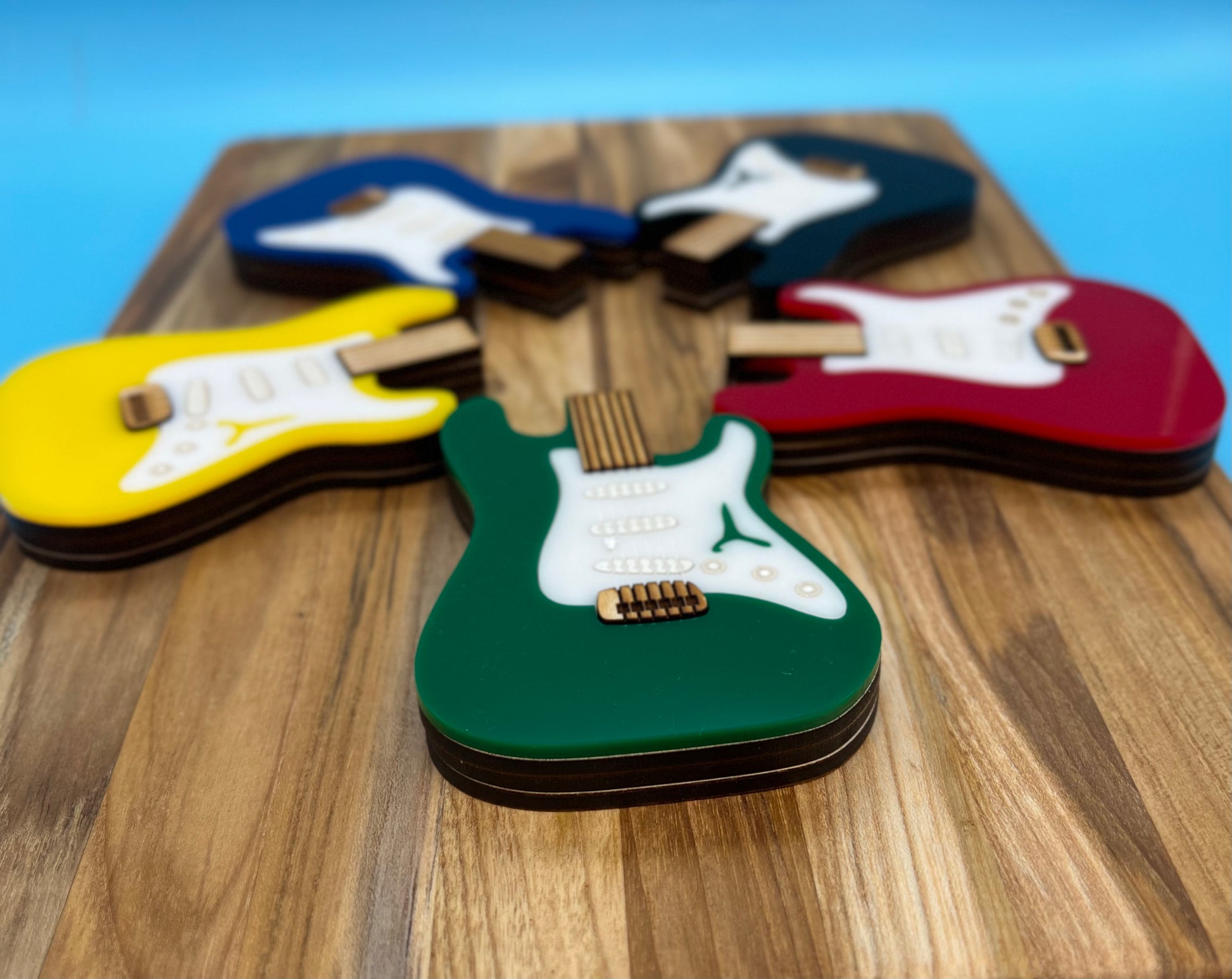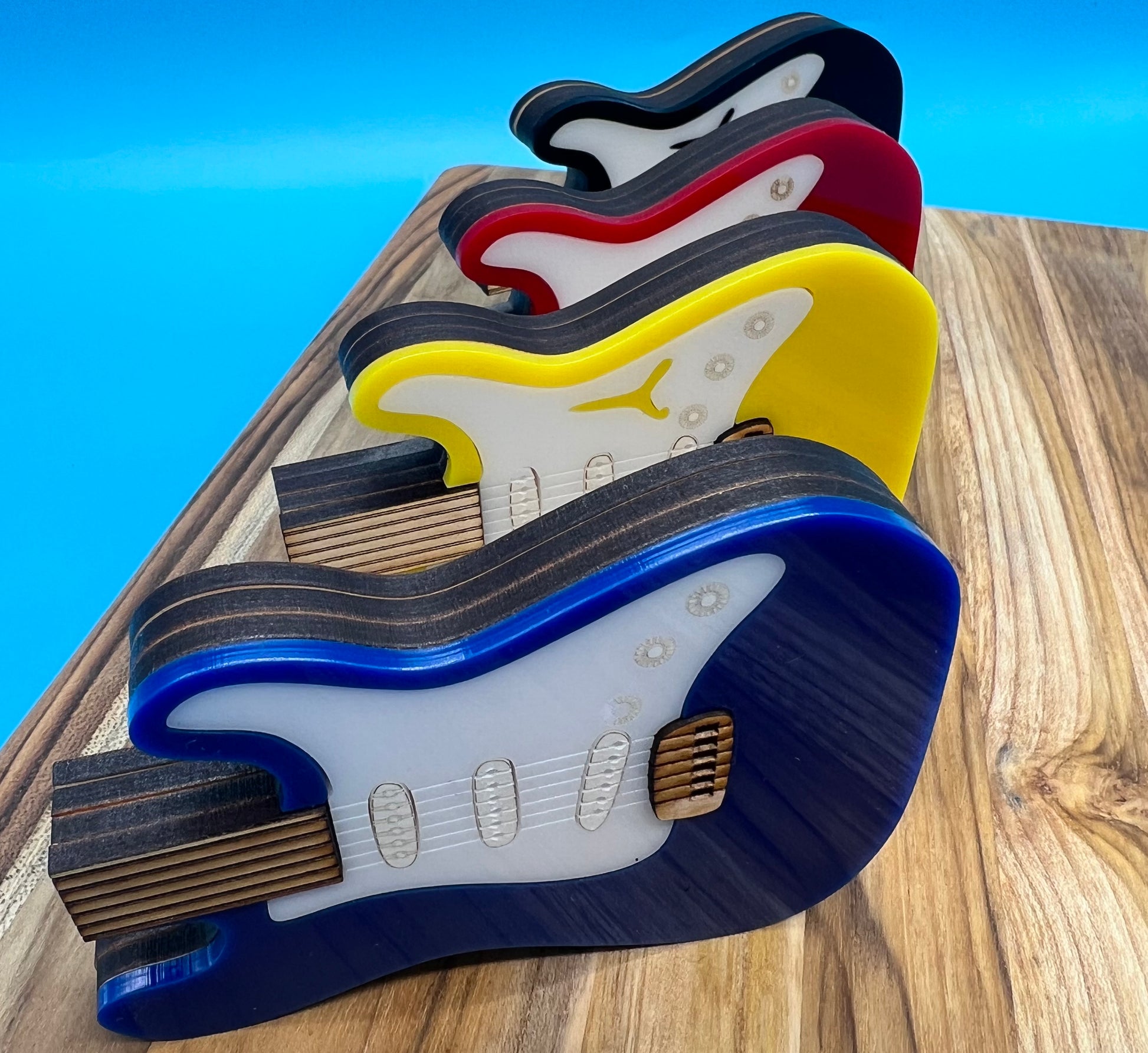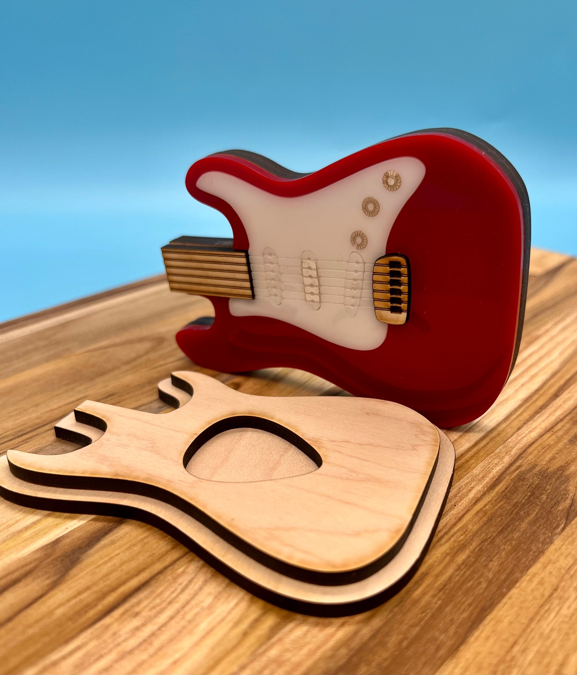 Introducing the Acrylic Guitar Pick Holder - the perfect accessory for any musician on the go. It is made from high-quality acrylic and wood and features a laser cut and engraved design that can be personalized. Whether it's your band's logo, your name, or a personal message, the Acrylic Guitar Pick Holder can be made truly one-of-a-kind. Not only is the Acrylic Guitar Pick Holder functional and stylish, but it's also practical. The compact size fits easily into any pocket or pouch, and the durable acrylic and wood materials protect your picks from wear and tear. Whether you're a seasoned musician or just starting out, the acrylic and wood guitar pick holder is a must-have for any guitar player. Guitar stand is included.