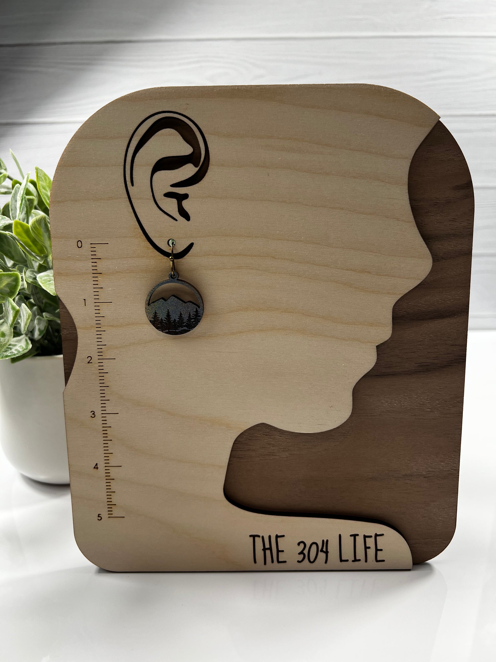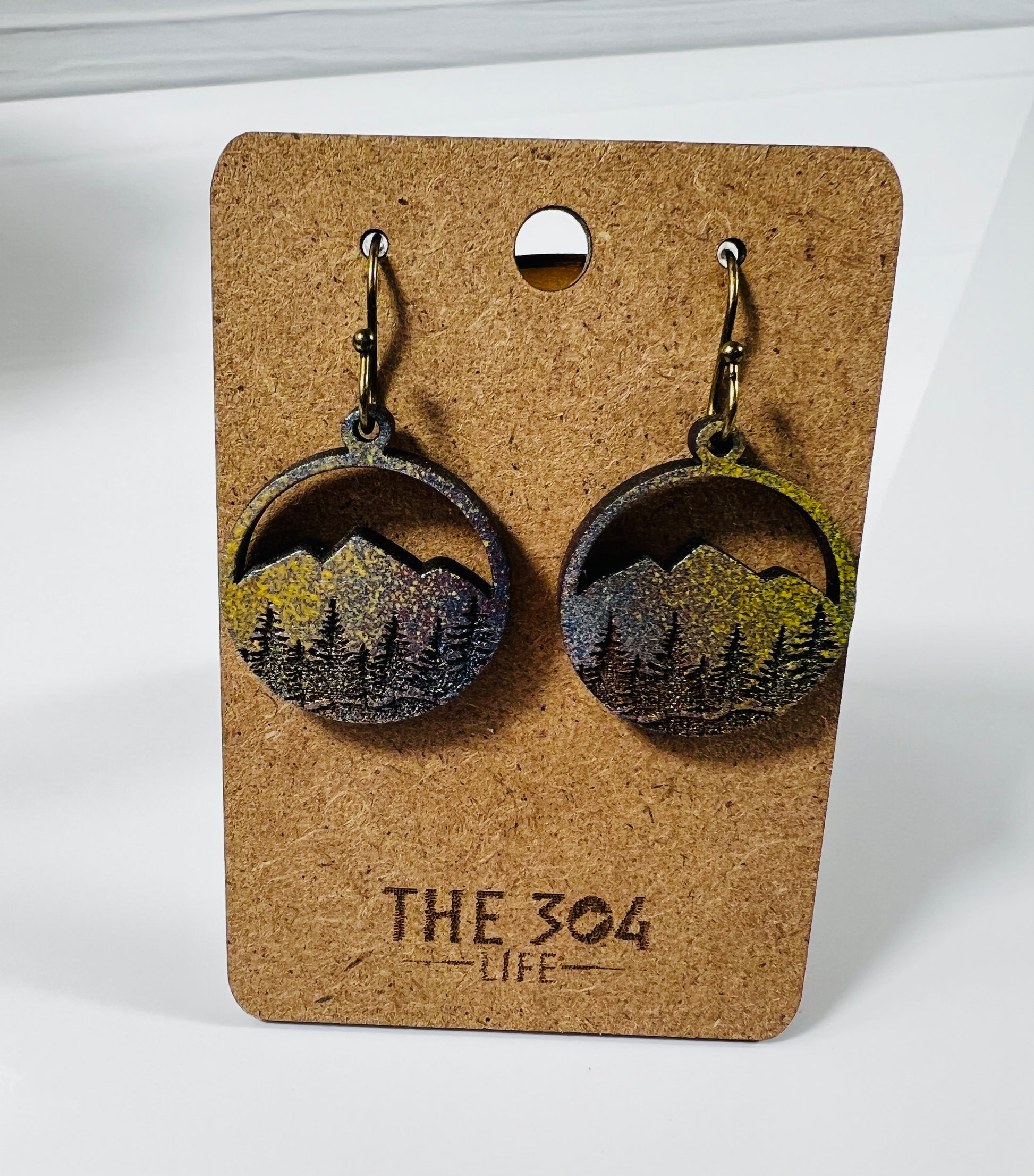These Mountain Sunset hand-painted last-cut and engraved wood earrings are a beautiful and unique accessory for any nature lover. These earrings feature a gorgeous mountain landscape painted in vivid detail. The warm and vibrant colors of the sunset create a stunning contrast against the natural wood tones, making these earrings a true statement piece.