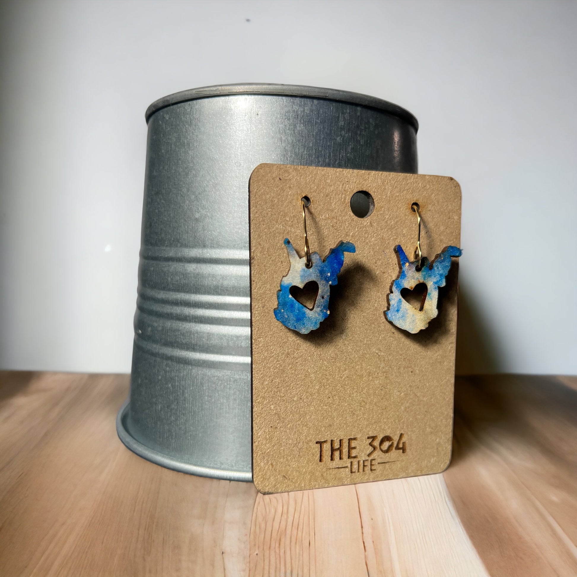 Celebrate West Virginia with our striking wood earrings featuring the iconic blue and gold state colors. These handcrafted beauties are adorned with a captivating pattern and come with stainless steel earring findings. Showcase your Mountaineer spirit with these eye-catching accessories.